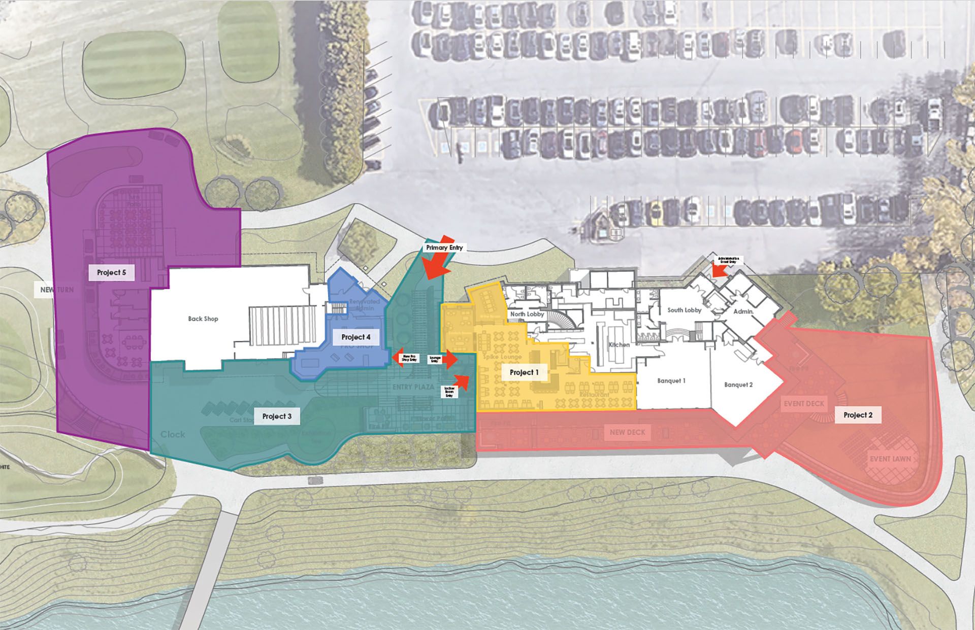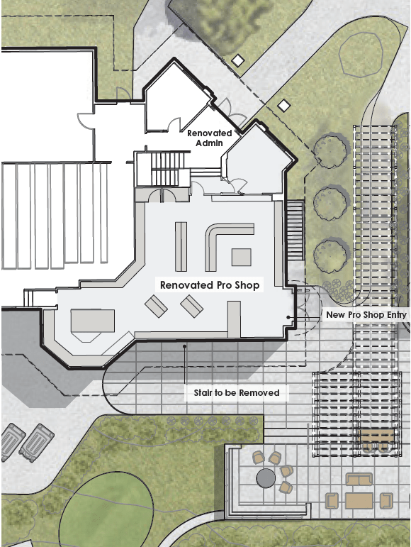Renovating the Pro Shop to enhance functionality and aesthetics. This phase improves the Pro Shop’s integration with adjacent spaces, such as the Spike Lounge and the main entry plaza.